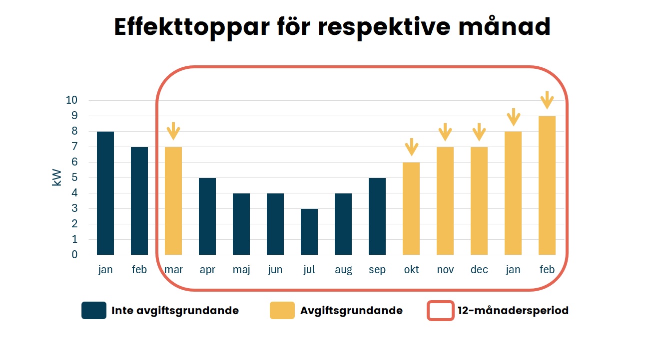 För att bestämma abonnerad effekt tittar vi på de sex månader under det gångna året som hade högst månadseffekt. Dessa månader ligger sedan till grund för den fasta avgiften som syns på din faktura månaden efter.
