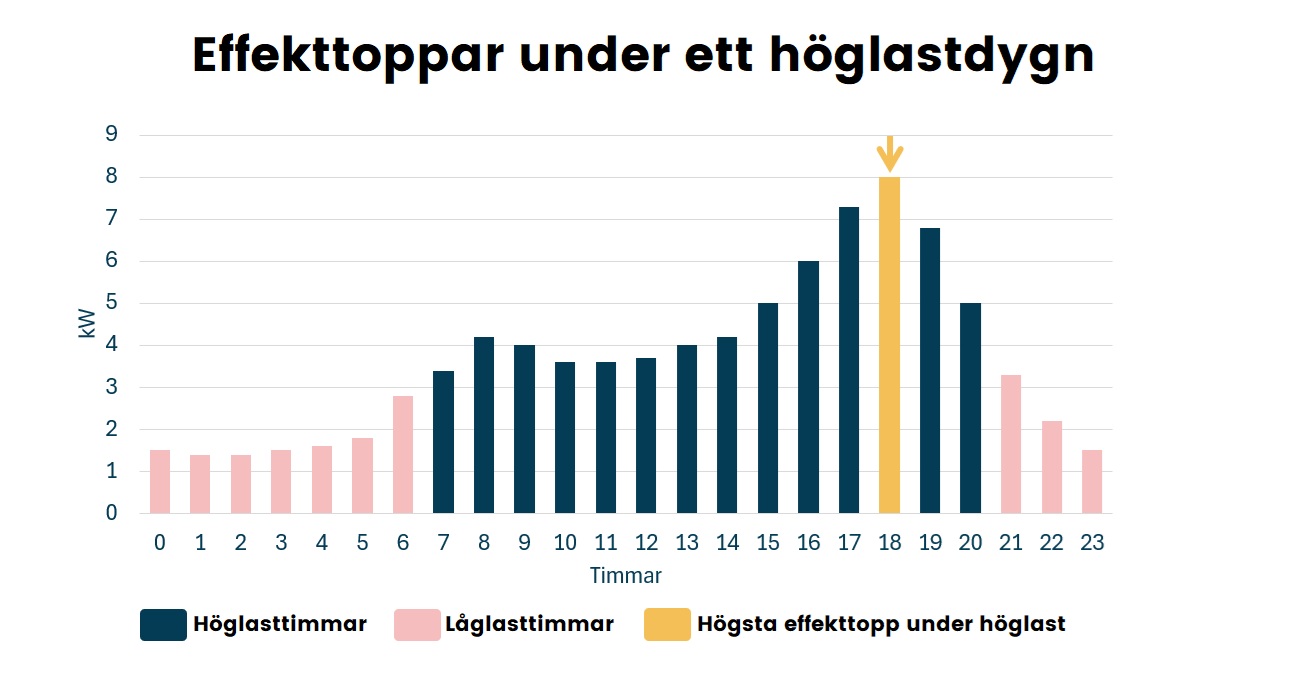 Månadseffekten ligger sedan till grund för effektavgiften som du betalar på fakturan månaden efter. Ju högre effekttoppar du har desto mer kommer du att få betala i effektavgift. Därför kan du få en lägre effektkostnad om du har möjlighet att sänka dina effekttoppar under höglasttid genom att flytta din elanvändning från helgfria vardagar från klockan sju på morgonen till nio på kvällen.