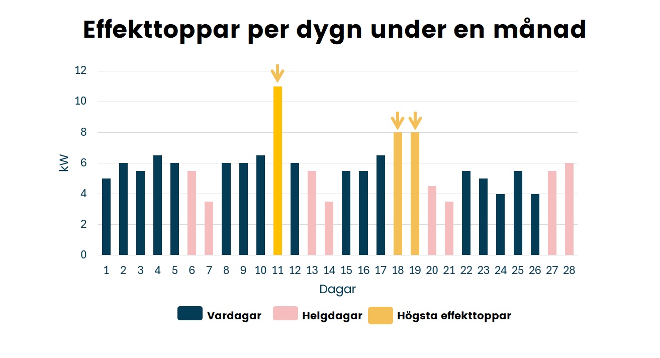 Varje månad under höglasttiden beräknas en månadseffekt från de högsta effekttopparna. Dessa baseras på hur mycket effekt du använde under en timmes tid från tre unika helgfria vardagar. Medelvärdet från dessa dagar är sedan grundande för effektavgiften. Redan i dag kan du i vår app se dina tre högsta effektoppar varje månad.