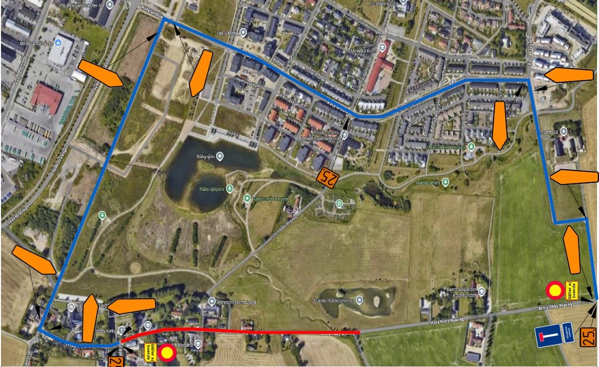 Delar av Stora Råby byaväg är därför helt avstängd (röd linje) med omledning av trafik (blå linje) för att vår entreprenör ska jobba säkert. Arbetet påbörjades 2025-09-29 och beräknas vara färdigt innan årsskiftet.