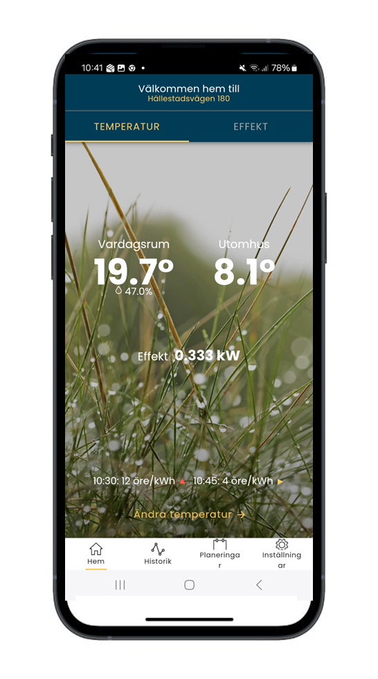I appen gör du dina inställningar samt ser all information om temperaturer, elspotpris och Ngenics Tunes styrning av värmepumpen.